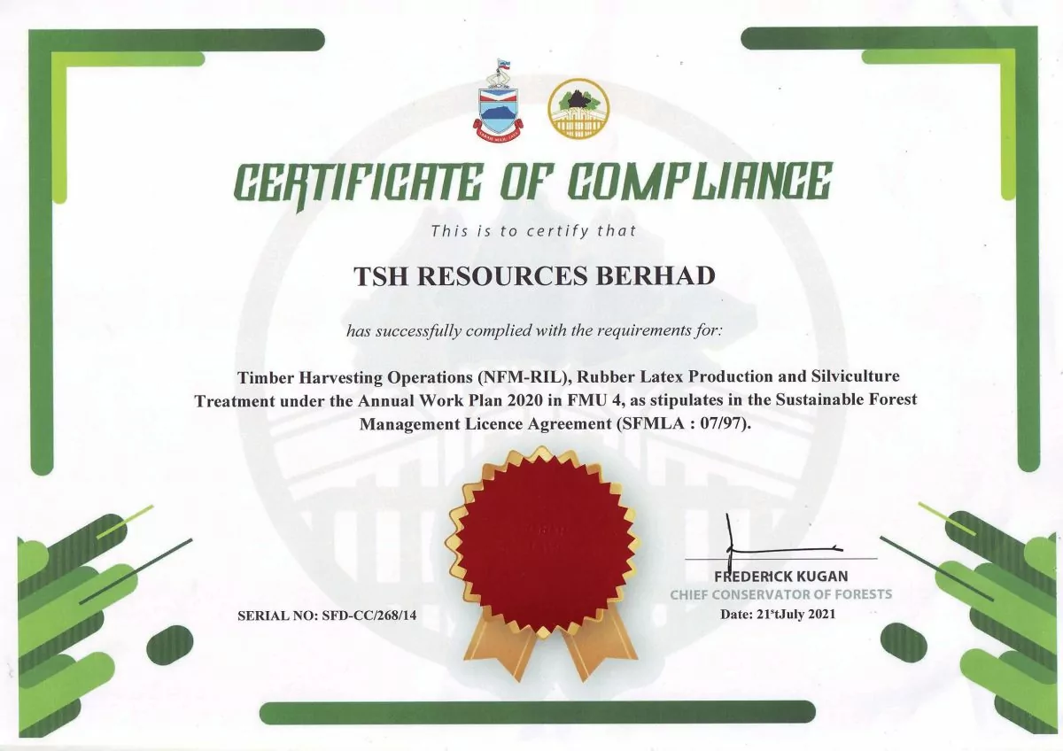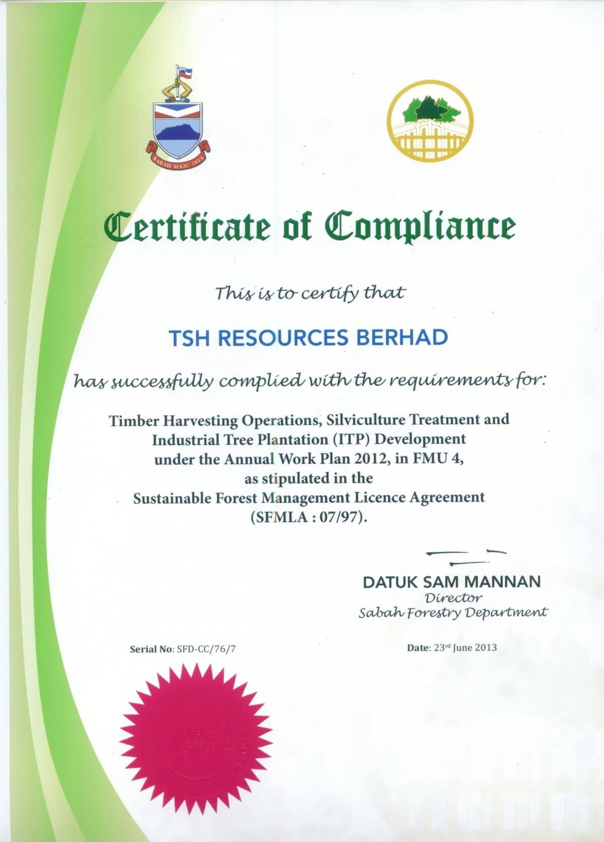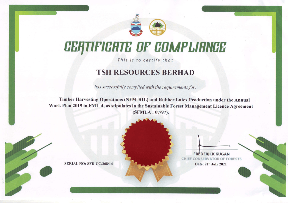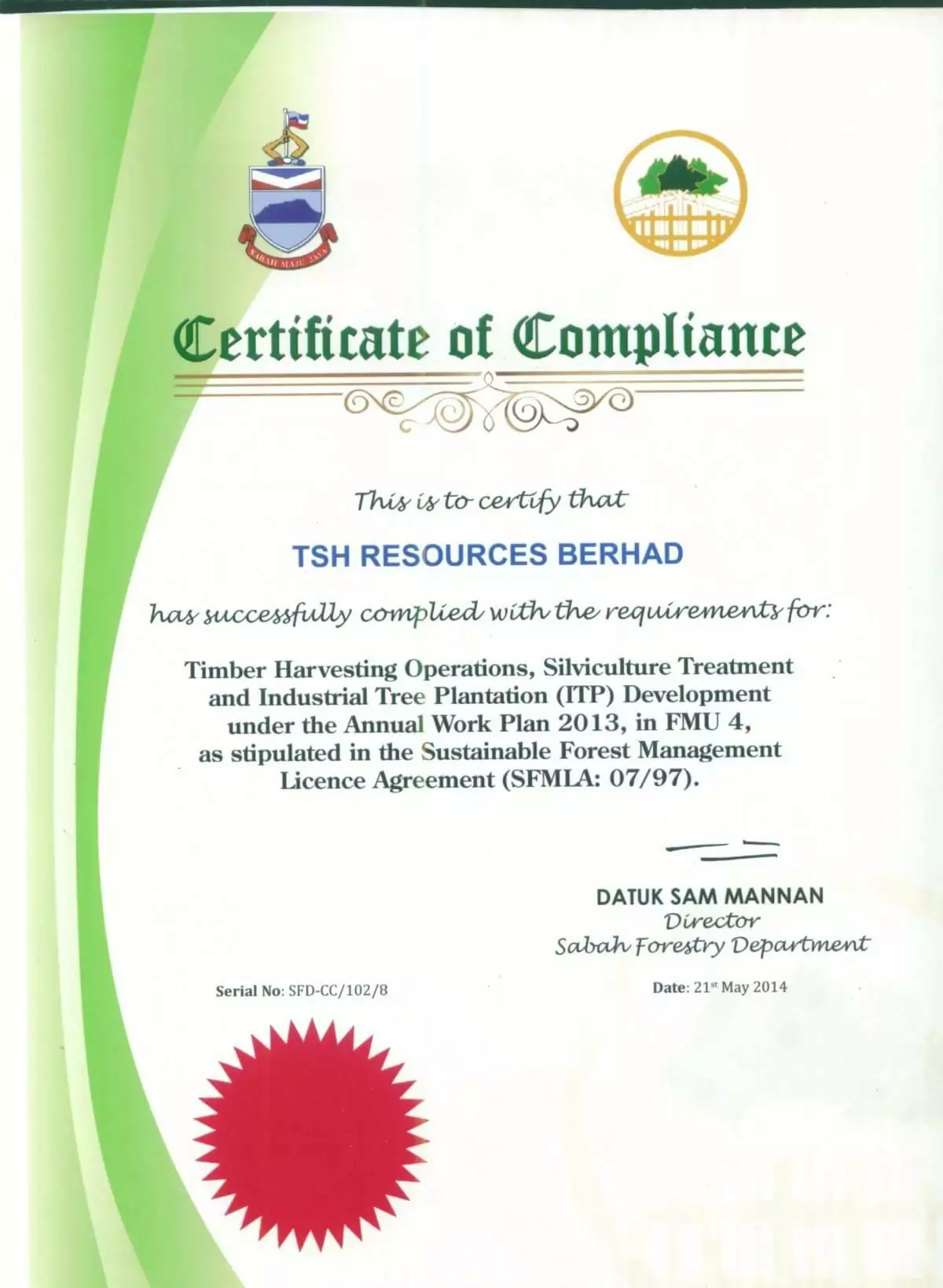 As testament to TSH exemplary commitment to Sustainable Forestry, TSH has obtained the Certificate of Compliance over a number of years.